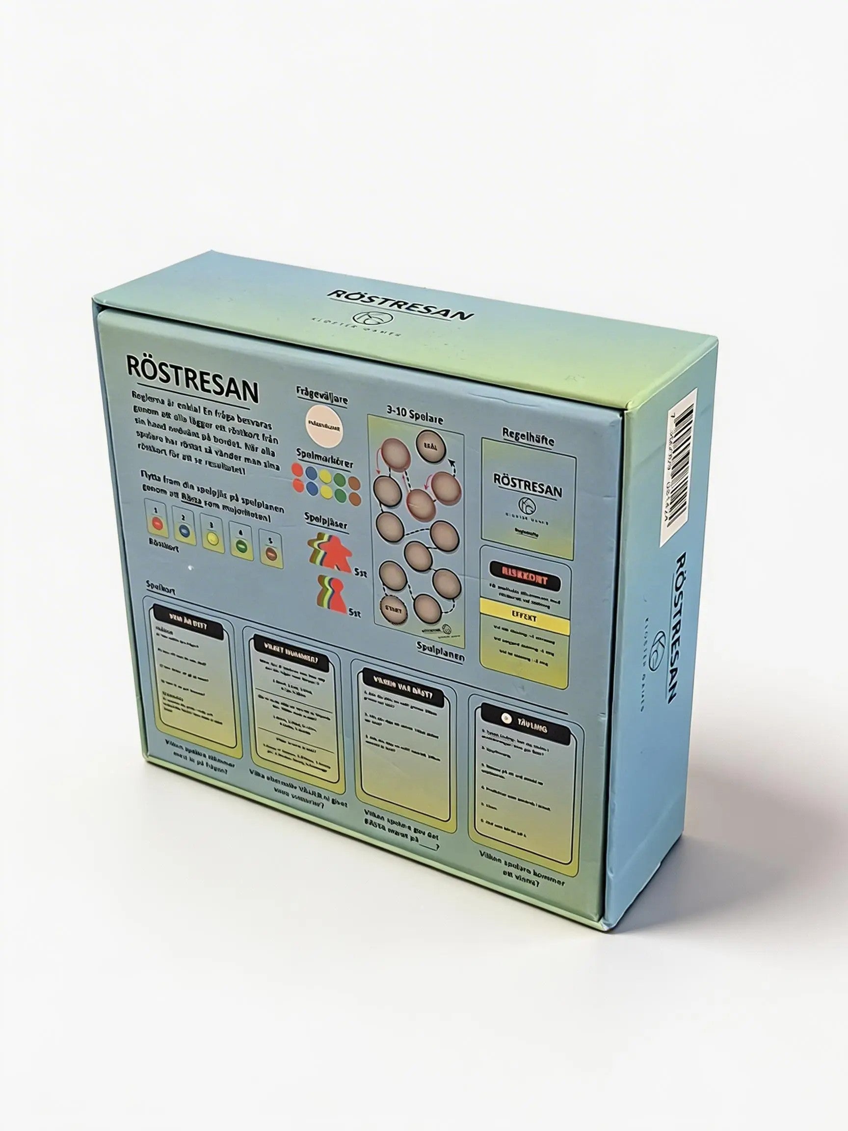 Röstresan är ett engagerande sällskapsspel för 3 till 10 spelare där allas åsikter räknas! Spelet går ut på att svara på frågor genom att rösta med röstkort, och sedan följa hur majoritetens val påverkar varje spelares framfart på spelplanen.